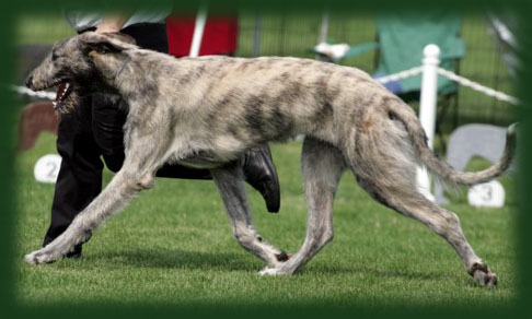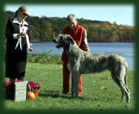 This exciting Manuka son made his show ring debut with a flourish at the IWANE Specialty in Warwick, RI USA 29 July 2007, winning both 6 to 9 month puppy male classes, Sweeps and Regular, and on to Reserve Winners Dog."His flawless movement gave him the edge" said breeder.judge Jette Holm Jensen from Denmark, over his half brothers, also Manuka sons, 6 month old Aotearoa Oldline Freehold Moa who placed second in the regular 6 to 9 month puppy class, Can Ch, Royeljoker's Tiger on the Loose, who won the Open male class and Best Head at this show, and an All Breed Best in Show winner in Canada, and 50+ other mostly adult male IWs. I am very grateful to Alan MacLeod for handling Salt in the classes while I stayed with "baby" Moa. For Winners Dog I had take over with Salt and I had a hard time keeping up with him. See the 2 movement photos below.