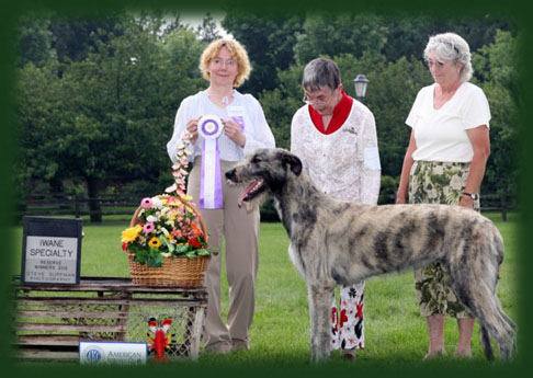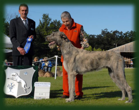 Throughout the remainder of 2007 Salt continued to impress judges in both Canada and the USA at IW Specialties and All Breed shows. While still a junior puppy he took his first 3 Championship points going Best of Breed, Best of Winners, and Best Puppy over an entry of 8 mostly adults including a Champion, under Sighthound specialist Pamela Bruce. One week later, at just 9 months he took the same wins again at the Capital Area Sighthound Association Specialty over a similar entry under Scottish Deerhound fancier Sandra Anderson, pictured below.
