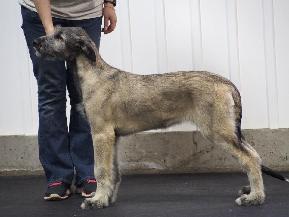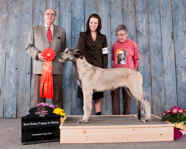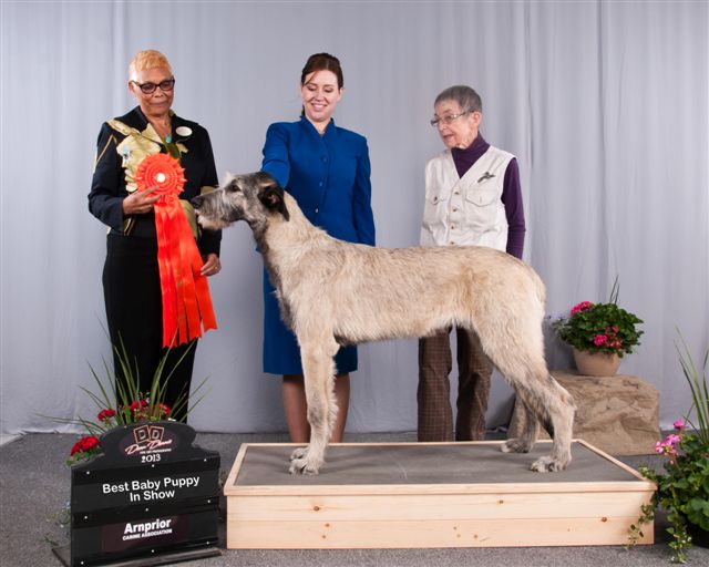 At his first Championship shows at the Champlain KC in Petawawa Ontario Tama took Best Baby Puppy in Breed and Group all 3 days, and 2 days out of 3 BEST BABY PUPPY IN SHOW!!! More Best Baby Puppy in Breed and Group followed, with comments from some judges he would have taken the breed over adults present if he had been over 6 months. After he turned 6 months he did just that many times to finish his Championship before 10 months of age. With 7 Best Puppy in Group awards and several adult Group placements also from the puppy classes Tama finished his first year as #1 Irish Wolfhound puppy in Canada for 2013 and #16 in the adult TOP DOG placements. But Tama’s most rewarding triumph of all for me was at his final show of the year, the IWAGS Specialty in Matamoras, PA, USA where he won my own AOTEAROA trophy for Best Head und breeder/judge Els Swelheim-Kruisinga from the Netherlands, joining his many Best Head Class winning ancestors and relatives at Specialties both sides of the border over the past 30+ years.