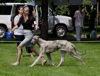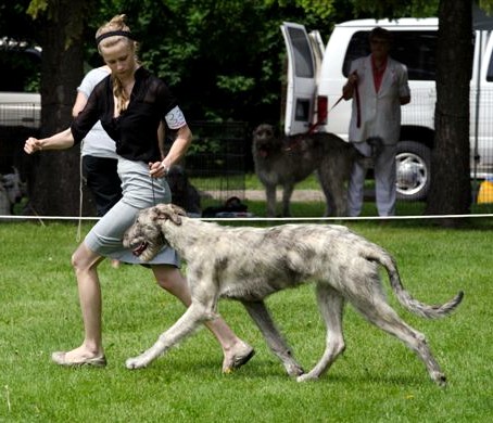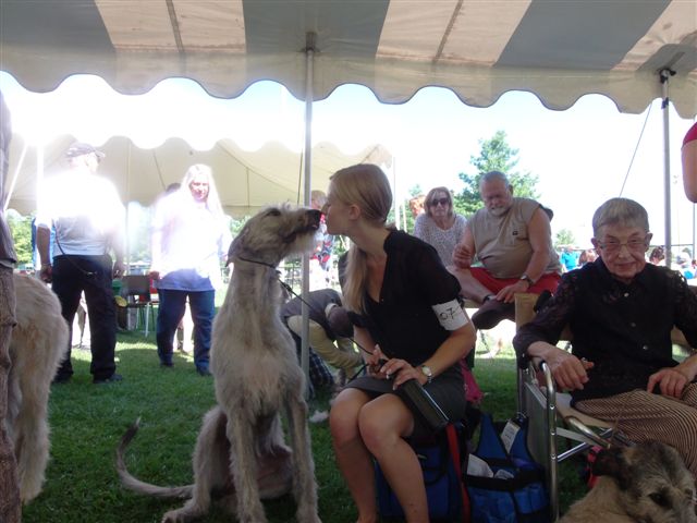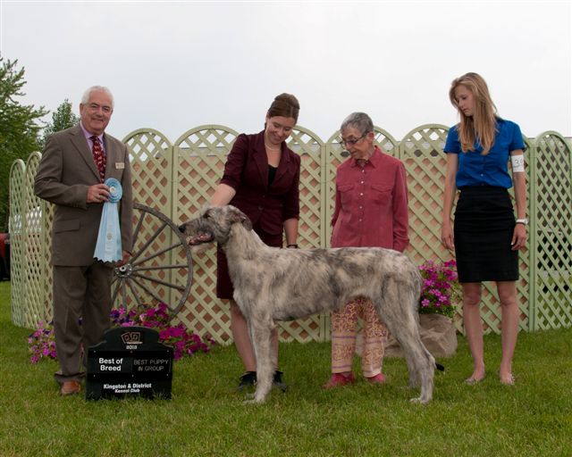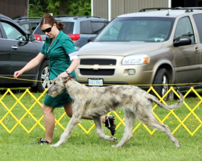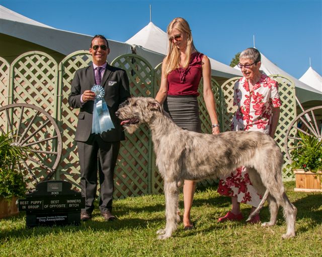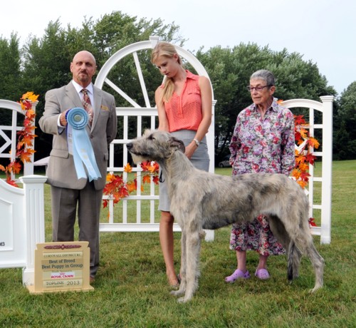 At first Tika was very much in the shadow of her precocious brother. Nobody seemed very interested in her, all eyes , wins and praise were for Tama. She felt the lack of attention too, and showed it by grabbing the stuffed toys he won for Best Baby Puppy as he came out of the ring, and not wanting to give them back! Then gradually she started to beat him more often as time went by, not only taking Best Puppy in Breed over her brother, but going to on to 3 Best Puppy in Group wins to finish the year as #4 Irish Wolfhound puppy in Canada for 2013. Tika finished her Championship from the puppy classes with Best of Breed wins over adults also, including a Multi Best in Show winning Champion Special, something her brother has not done...yet! Tika has been beautifully handled mostly by Savannah Vince, who she ADORES, and occasionally by Christine Pollen.